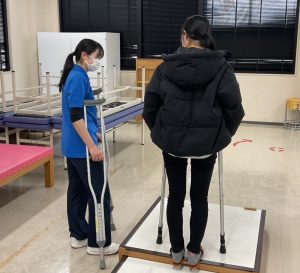 体重のかけ方を確認しながら練習を行い、理学療法士が患者さんに寄り添い、安全に歩行を支える仕事であることを実感していただけました。